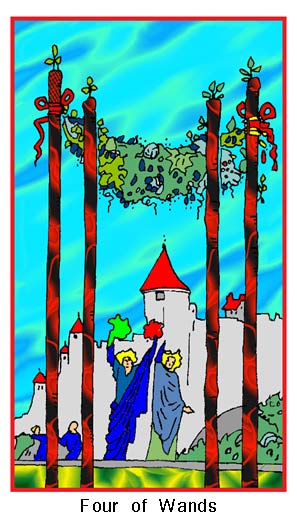 Your Daily Tarot: The Four of Wands… and this Fire element card involves laying foundations (No. 4), creating a harmonious home zone, celebrating some form of stability in your life. Completion is on the table, as you reap the rewards that come from a challenging series of events. Home make-overs get a vote, or it could be a total change of residence, or maybe buying or selling property is on your bucket list. It’s about catch-ups with those you consider family. The Four of Wands often points to firming up a relationship, with engagement or marriage looming (especially if the Two of Cups is close by!).